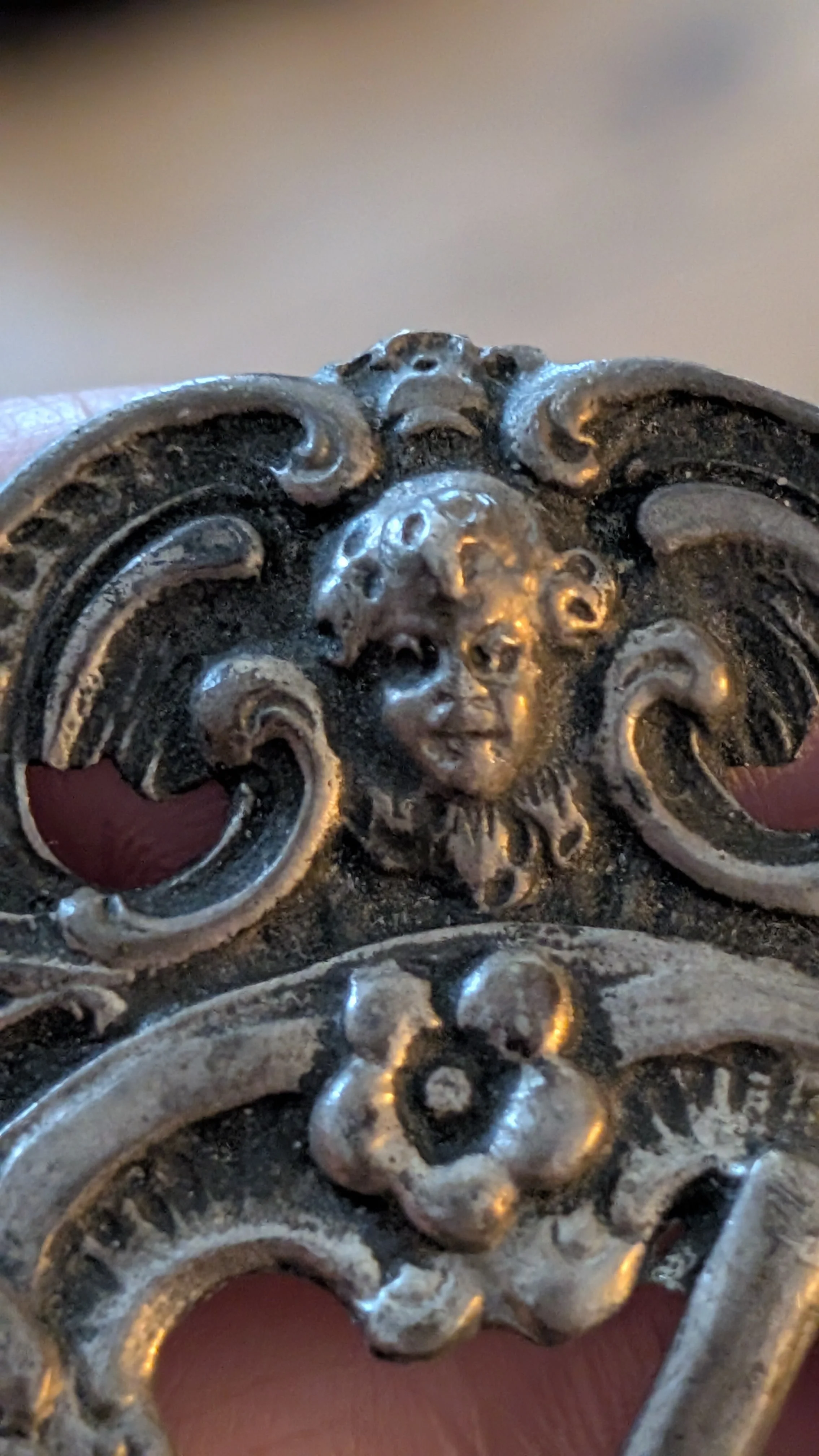 Scrolled etched filigree round wreath with three cherub faces.